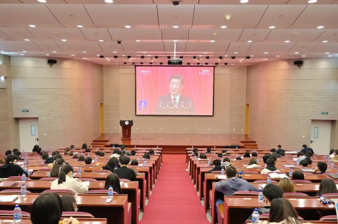 我校积极部署,在学院路校区晨兴音乐厅、新主楼第一报告厅和沙河校区咏曼剧场同步设置直播会场,组织全体在校校领导、处级干部,马克思主义学院教师、专兼职辅导员及党员师生代表共800余人集中观看。