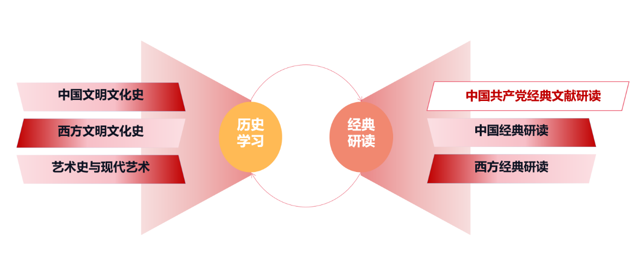 历史是最好的教科书,知行书院开设《中国共产党经典文献研读》专题思政课,引导学生读原著、学原文、悟原理,与书院原有的《中国文明文化史》、《西方文明文化史》《艺术史与现代艺术》《中国经典研读》《西方经典研读》课程组成了“三史三读”课程体系,拓展和延续了知行书院经典研读通识教育,形成了文科大类通识教育体系的新格局。