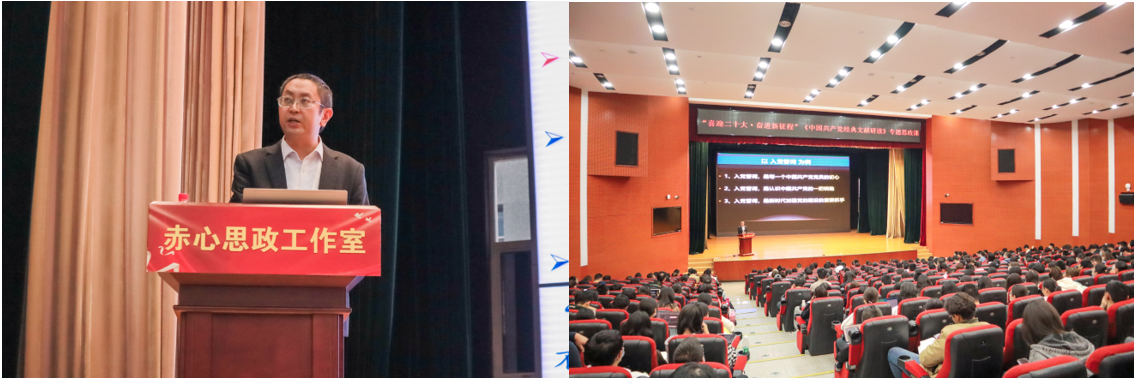 10月5日下午,《中国共产党经典文献研读》专题思政课第一课开讲。本次课程邀马克思主义学院分党委书记高宁教授带来题为《谈谈学习党章的方法——以 < 入党誓词> 为例》的 报告,来自知行书院、守锷书院、宇航学院等10余学院(书院)共400余名学生共同学习了本次课程。