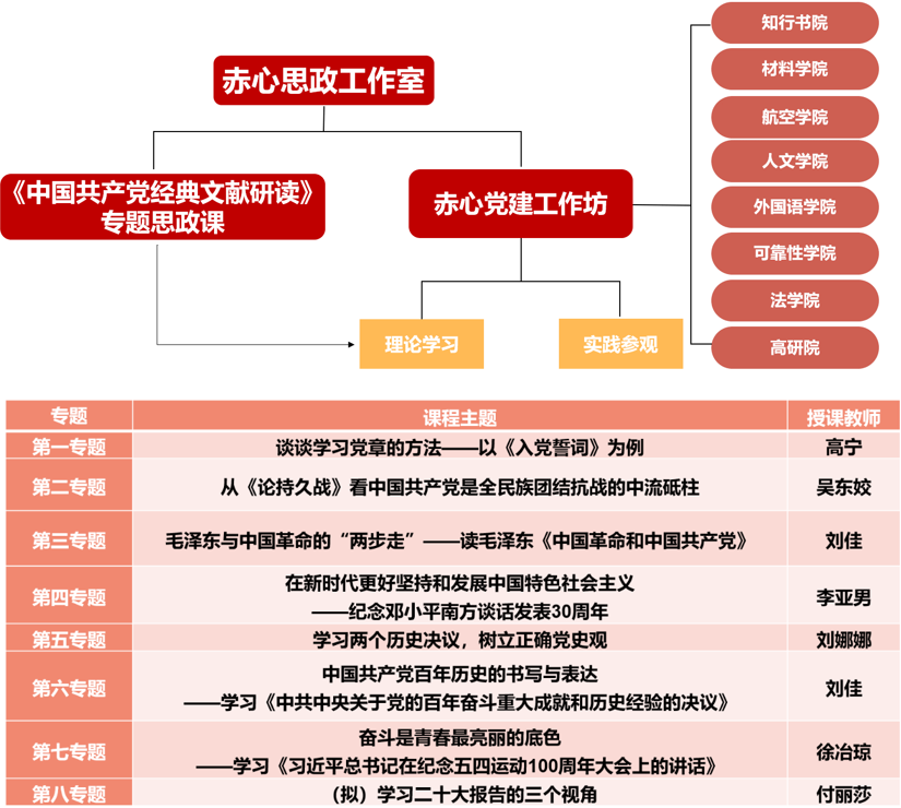 在喜迎党的二十大胜利召开和北航建校70周年之际,知行书院在学校党委宣传部、学生处及北航学院的指导下,联合马克思主义学院、文科大类专业学院共建赤心思政工作室,以入党积极分子培养为抓手,扎实推进党建和思想政治教育工作,筑牢青年学生思想政治教育的重要阵地,发挥书院-学院双院协同机制,构建文科大类思想政治教育新格局。