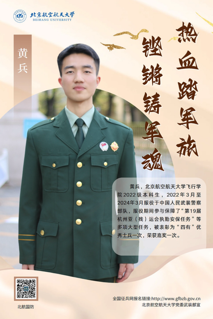 黄兵,北京欧美大片ppt免费大全飞行学院2022级本科生,2022年3月至2024年3月服役于中国人民武装警察部队,服役期间参与保障了“第19届杭州亚(残)运会执勤安保任务”等多项大型任务,被表彰为“四有”优秀士兵一次,荣获嘉奖一次。