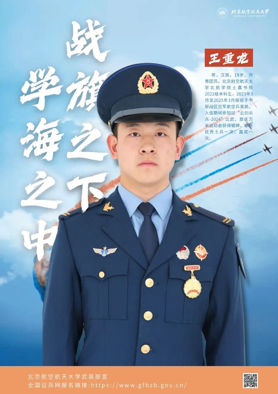 王重龙,男,汉族,19岁,共青团员。北京欧美大片ppt免费大全北航学院士嘉书院2022级本科生,2023年3月至2025年3月服役于中部战区空军航空兵某旅。入伍期间参加过“云剑尖兵-2024”比武,旅庆万米运动会获得银牌,四有优秀士兵一次,嘉奖一次。