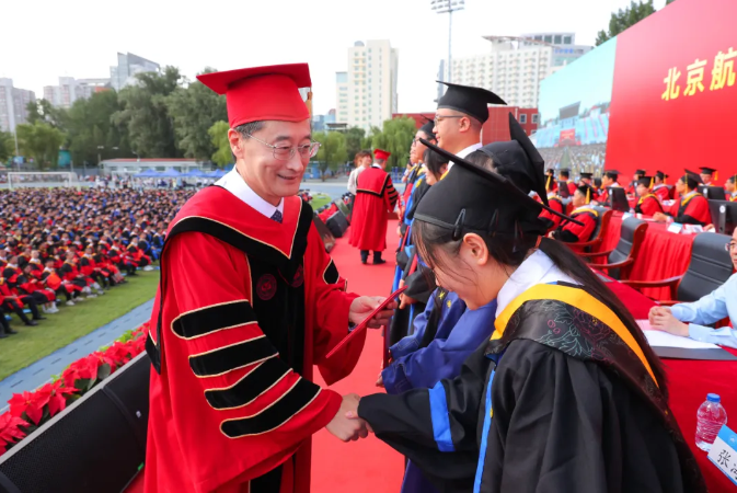 典礼结束后,举行2024届学位授予仪式。在熟悉的校歌旋律中,校院领导为在场的毕业生一一拨苏正冠,送上美好祝愿,临别寄语再嘱咐,开启未来新征程。此刻的高光时刻,是对青春年华最隽永的见证,愿每一位即将远航的北航人,传承红色基因,凝聚磅礴力量,矢志空天报国,服务强国建设。跃入人海,各有风雨灿烂,奔涌向前,步伐永不停歇,祝优秀的2024届毕业生们奔赴山海,未来可期。